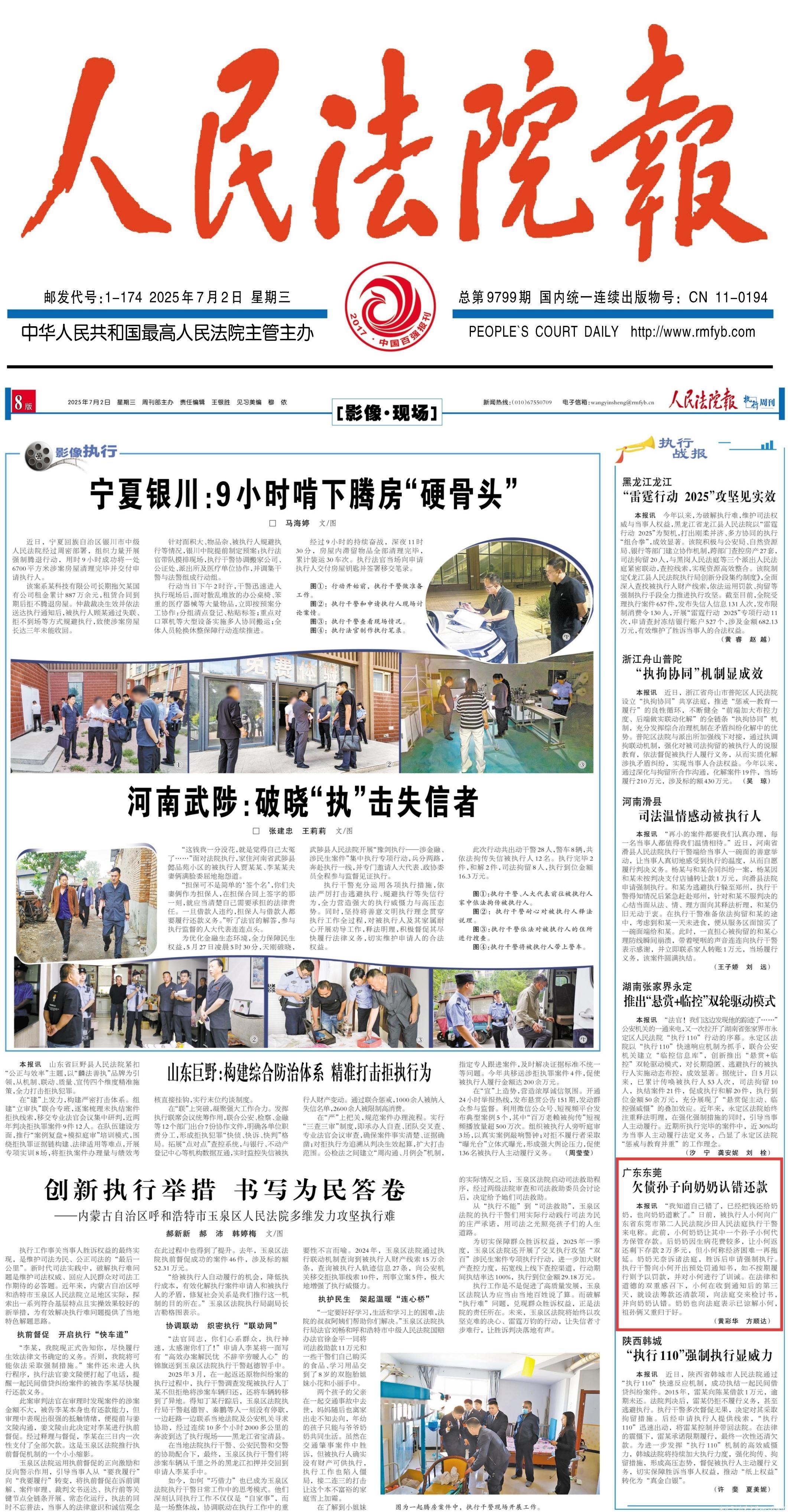 2025年7月2日,《人民法院报》8版刊登了我院沙田法庭的执行工作报道《欠债孙子向奶奶认错还款》。